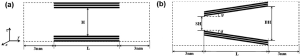 狹縫孔由半有限狹縫孔由兩個(gè)平行的石墨壁組成。每個(gè)壁包含三個(gè)石墨烯層,如圖1(a)所示。框的虛線表示模擬框在y和z方向上的邊界。周期性邊界條件僅適用于x方向。兩個(gè)開(kāi)口端與大塊氣藏相連,每個(gè)氣藏沿y軸的長(zhǎng)度為3nm,孔隙寬度決定了z方向的尺寸。因此,通過(guò)孔內(nèi)分子與體相的相互作用,可以在孔和周?chē)h(huán)境之間保持機(jī)械平衡。孔徑H是指通過(guò)一個(gè)壁最內(nèi)層中碳原子中心的平面與相對(duì)壁的相應(yīng)平面之間的距離。楔形孔在圖1(b)描繪了一個(gè)開(kāi)放的楔形孔及其結(jié)構(gòu)參數(shù):小端(SH)和大端(BH)的孔徑,軸向孔長(zhǎng)(L)和半角(α)。框的虛線表示模擬框在y和z方向上的邊界。與狹縫孔一樣,開(kāi)口端周?chē)臍怏w沿y軸的長(zhǎng)度為3nm,大端的寬度決定了z方向的尺寸。沿軸向(即,y方向)的孔長(zhǎng)度是有限的L,而在x方向上的尺寸在應(yīng)用周期性邊界條件的情況下假定為無(wú)限。