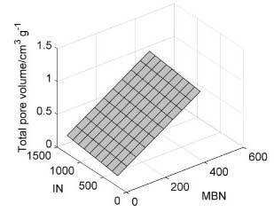 通過線性模型建立亞甲藍和碘值與總孔容的關系。使用由Kennard-Stone算法從39中選擇的10個樣本對表面進行建模(圖5)。