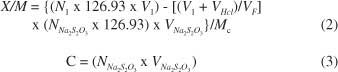 碘值根據ASTM D4607-94方法測定。碘值定義為當濾液的碘濃度為0.02N(0.02mol L -1)時,被1.0g碳吸附的碘的毫克數。該方法基于三點等溫線。標準碘溶液在特定條件下用三種不同重量的活性炭處理。實驗包括用10.0mL的5%HCl處理活性炭樣品。該混合物煮沸30秒,然后冷卻。之后不久,將100.0mL的0.1N(0.1mol L -1)碘溶液加入到混合物中并攪拌30秒。將所得的溶液過濾并50.0毫升濾液滴定用0.1N(0.1摩爾大號-1)硫代硫酸鈉,以淀粉為指示劑。每克碳吸附的碘量(X / M)相對濾液(C)中的碘濃度繪制,使用對數軸。如果殘留碘濃度(C)不在0.008-0.04 N(0.008-0.04 mol L -1)的范圍內,則每個等溫點應使用不同的碳質量重復整個過程。對這三點應用最小二乘擬合回歸。碘值是殘留濃度(C)為0.02N(0.02mol L -1)時的 X / M值。所述X / M和C ^ 值分別由等式2和3計算。