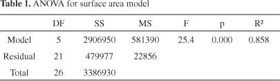 為了描述亞甲基藍和碘的數量相對于表面積的行為,使用二次模型。對于模型開發,Kennard-Stone算法從105個樣本中選擇了27個樣本并用于校準。樣品表面積從199到2105 m 2 g -1不等。亞甲基藍的數量在0到501毫克克每升之間,碘值從155到1670毫克克每升。建模后獲得的表面擬合(圖1)由公式4描述。