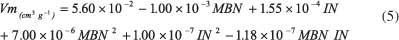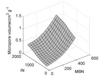 也使用二次模型將微孔體積描述為亞甲藍和碘值的函數。該模型在總共50個樣本的幫助下構建,其中從KS算法中選擇了14個樣本進行校準。校準范圍為0.05至0.99cm 3 g -1。從2至427毫克克變化亞甲藍號-1和碘號碼變化從195至1670毫克克-1。建模導致表面擬合(圖3),由公式5描述: