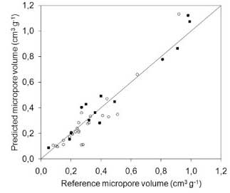 這個方程適用于微孔體積預測,用包含文獻中的數據和由我們獲得的數據的測試樣品進行評估。共測試了36個樣本。圖形比較(圖4)表明該模型具有良好的預測能力。該試驗樣品組的平均絕對誤差為0.05cm 3 g -1,平均相對誤差為16.4%。表2給出了模型的統計參數。