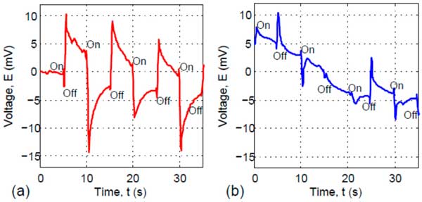 對(duì)含二氧化鈦的碳纖維復(fù)合材料進(jìn)行了光敏性測(cè)試。熒光燈管用于產(chǎn)生可見(jiàn)光。電化學(xué)工作站用于記錄光子電壓響應(yīng)數(shù)據(jù)。將復(fù)合碳纖維置于透明載玻片上,并使用鋁箔條形成導(dǎo)電路徑。將光源控制為“開(kāi)”5秒,然后“關(guān)”5秒。得到的測(cè)試結(jié)果如圖2所示。曲線如圖2,發(fā)現(xiàn)該纖維樣品所具有半導(dǎo)體行為。當(dāng)可見(jiàn)燈泡切換到“開(kāi)”位置時(shí),光照導(dǎo)致陽(yáng)極產(chǎn)生電子,電壓變得更負(fù)。然而,當(dāng)燈“關(guān)閉”時(shí),發(fā)現(xiàn)電壓出現(xiàn)正浪涌,如圖2a所示。這種n型行為與在活性炭化纖維中添加鈷摻雜的鈦基氧化物顆粒有關(guān)。如果沒(méi)有鈷此外,光敏性是沒(méi)有那么強(qiáng),如圖2陽(yáng)極處的光子感應(yīng)電壓不是那么穩(wěn)定,這也顯示在圖2b中,基線漂移較大。