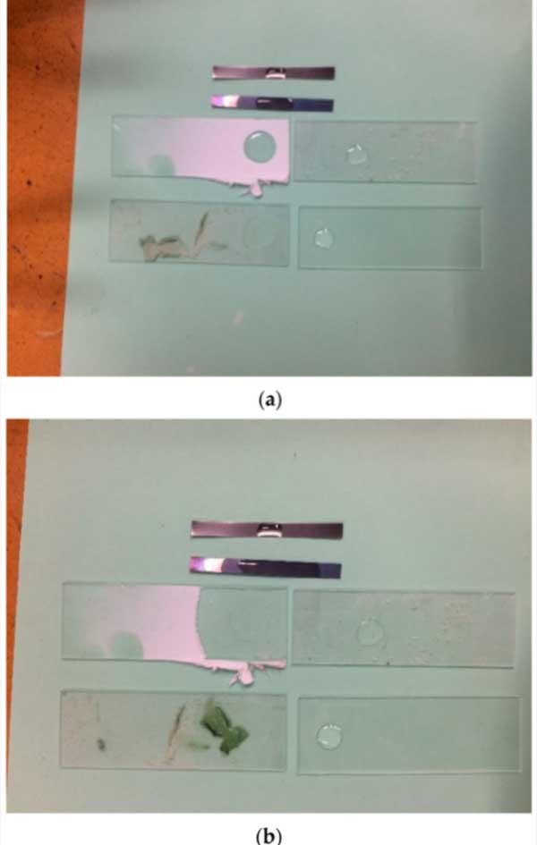 圖3:暴露在陽(yáng)光下10分鐘(a)和暴露20分鐘(b)后載玻片上的油滴照片。