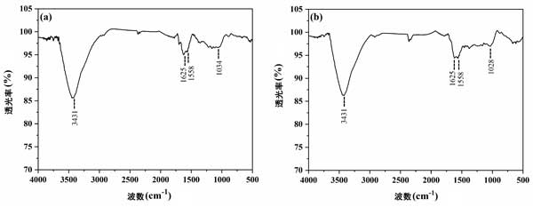 圖2:(a)活性炭1和(b)活性炭2的FTIR振動光譜。