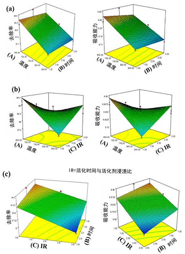 圖1:活性炭的(a)活化溫度和浸漬比(b)活化溫度和活化時間(c)浸漬比和活化時間,去除率和吸附能力對表面響應曲線的影響。