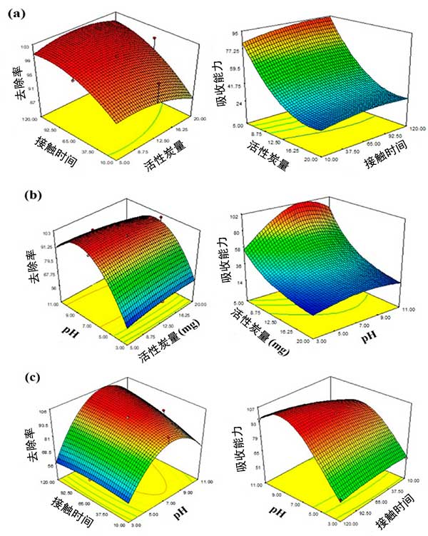 圖3:表面響應圖吸附參數對去除和吸收能力的影響(a)活性炭劑量與接觸時間的相互作用;(b)活性炭與pH之間的相互作用;(c)相互作用pH值與接觸時間。