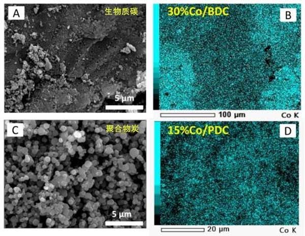 使用掃描電子顯微鏡(SEM)觀察由植物殼和酚醛樹脂的熱解獲得的活性炭的表面形態(tài),并分別在圖1A,C中示出。可以看出,不同的碳前體產(chǎn)生不同的表面形態(tài)。生物質(zhì)衍生的碳顯示出剛性和致密的結(jié)構(gòu),這是典型的木炭特征。而聚合物衍生的碳呈現(xiàn)具有粒子網(wǎng)絡(luò)的碳球,在球體之間產(chǎn)生大的空隙。然后將兩種活性炭用作氧化鈷的載體。為了觀察金屬氧化物在活性炭上的分散,進(jìn)行了SEM與能量色散X射線(EDX)的元素映射。圖1B,D表示裝載在兩種材料中的氧化鈷的代表。所有都顯示鈷材料(在青色中顯示)在活性炭中的均勻分散。這表明通過浸漬方法中描述的簡單化學(xué)計(jì)量計(jì)算很好地實(shí)現(xiàn)了元素鈷的目標(biāo)負(fù)載。換句話說,上述結(jié)果清楚地顯示了制備氧化鈷活性炭的成功制備步驟。