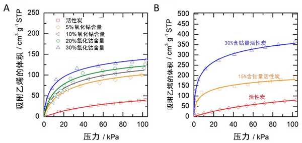 測試氧化鈷浸漬的活性炭的性能以進(jìn)行乙烯吸附。圖2A顯示在具有和不具有0-101kPa壓力范圍的氧化鈷活性炭中的乙烯吸附等溫線。吸附乙烯的體積定義為標(biāo)準(zhǔn)溫度和壓力下的體積。通常,可以看出乙烯吸收隨著壓力的增加而增加。大量乙烯吸附至40kPa壓力。當(dāng)將壓力增加到40kPa以上時(shí),所有樣品可以進(jìn)一步吸附少量乙烯(添加10%-25%)。氧化鈷浸漬的活性炭是無負(fù)載的活性炭兩倍的乙烯吸附量,它清楚地表明氧化鈷在增強(qiáng)活性炭對(duì)乙烯吸附方面效果比較好。增加氧化鈷的含量進(jìn)一步增加了乙烯在氧化鈷浸漬的活性炭上的吸附能力。當(dāng)使用30%氧化鈷時(shí)能達(dá)到較高吸附容量。