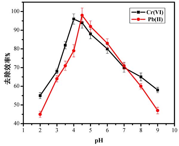 圖2:pH對活性炭上鉛(II)和鉻(VI)離子吸附的影響。