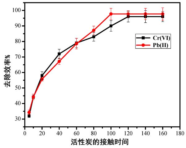 接觸時間的影響:使用較早獲得的合適活性炭劑量為0.80和1.0 g/100 mL,研究了接觸時間對Pb(II)和Cr(VI)離子在活性炭上吸附的影響。實驗是在25°C的合適金屬離子濃度值下進行的。Pb(II)和Cr(VI)離子分別為50.0和70.0 mg/L。如圖4所示,所研究的金屬在100和120分鐘后的最大去除效率達到98%和96%。而且,接觸時間的進一步增加對兩種金屬離子的去除沒有顯著影響。