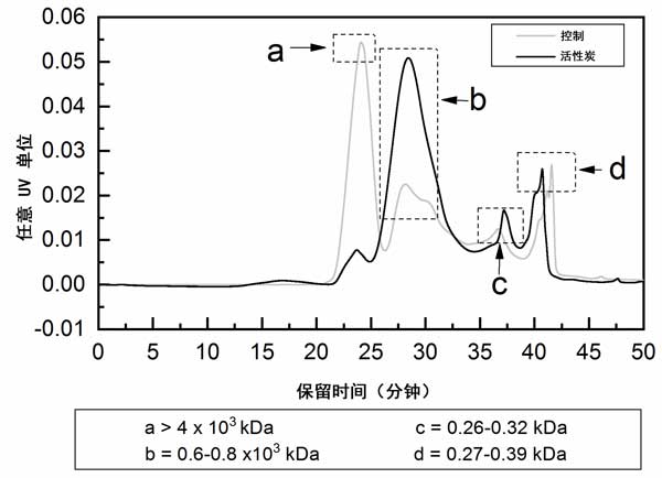 為了檢驗活性炭改變可溶性微生物組成,使其對膜具有更高的親和力這一假設,通過GPC分析了構成可溶性微生物的有機分子的大小分布(圖1)。在第二次可溶性微生物運行結束時收集了可溶性微生物樣品(圖1b),有趣的是,GPC色譜圖顯示了對照反應堆和活性炭加入反應堆之間的明顯差異。在活性炭反應器的可溶性微生物中,保留時間為24分鐘時,來自對照反應器的可溶性微生物的第一個峰顯著降低,而在活性炭反應器的可溶性微生物中,在28分鐘時觀察到峰的上升(圖1,分別是峰值a和b)。活性炭反應器的可溶性微生物中的37分鐘處的峰也升高(峰c)。可溶性微生物中某些有機化合物含量的變化(升高或降低)可能歸因于,由于微生物群落組成的變化或某些活性炭所觀察到的代謝活性增強,導致某些微生物產品的產生和分泌增加另外,或抑制進水橄欖油廢水中物質的降解。有機化合物對活性炭顆粒的吸附只會降低其在可溶性微生物中的外觀。由于吸附到活性炭上,可溶性微生物中某些成分的減少(如峰a所示)也有可能優先吸附其他成分,這些成分對通量的減少更不利,或者起膜調節前體的作用,這可能會增強生物膜的生長(例如峰b–d)。顯然,確定膜上有機污染物的身份是一項必不可少的任務,目前,尚不清楚不同可溶性微生物組分對膜污染的詳細影響以及它們被活性炭的吸附。