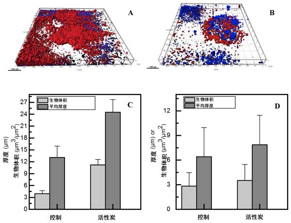 為了分析由于在膜生物反應器中添加活性炭而導致生物膜形成增加的可能性,并進一步闡明活性炭反應器中膜性能下降幅度更大的原因,在第一個處理結束時進行了檢測(圖2A,B)。在比較兩個反應器之間生物膜結構的性質時,可以觀察到活性炭反應器通量下降的增加顯然與生物膜生長的幅度有關。在第一次膜生物反應器運行結束時從模塊上獲取的兩塊膜上生物膜的CLSM分析顯示,活性炭和對照反應器之間細胞的生物體積及其自相關EPS的差異很大(圖2)。當補充活性炭時,生物膜生長的升高支持了膜滲透性的更高降低,這是由可溶性微生物組分吸附的升高引起的,這可能會更好地調節膜表面,從而增強生物膜的形成。