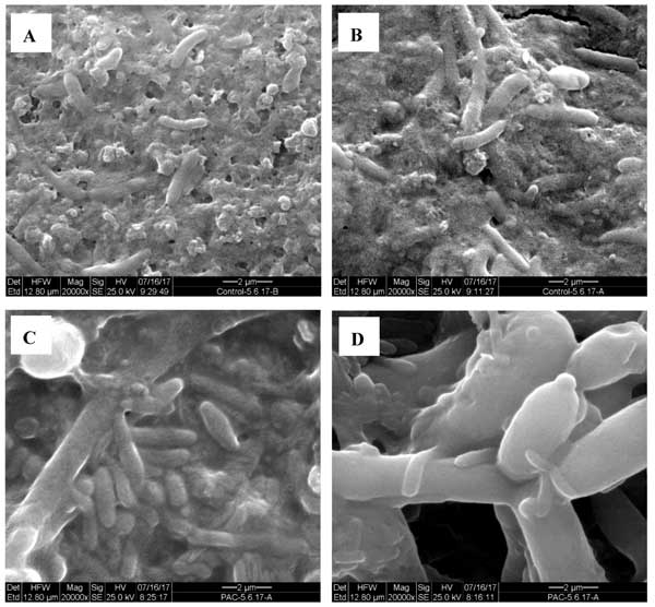 由于添加了活性炭的膜生物反應器膜滲透性的更大降低可能歸因于活性炭顆粒,因此在第一個實驗結束時對結垢的膜進行SEM成像(圖3)。沒有觀察到來自活性炭和對照的生物膜形態的主要差異,并且在兩種情況下,均檢測到EPS基質中的包埋細胞。值得注意的是,從填充了活性炭的反應器收集的任何樣品中都未發現活性炭顆粒(圖3c,d)。因此,在活性炭反應器中跨膜壓力的升高和膜滲透性的更高降低不能歸因于活性炭顆粒對膜的物理阻塞。