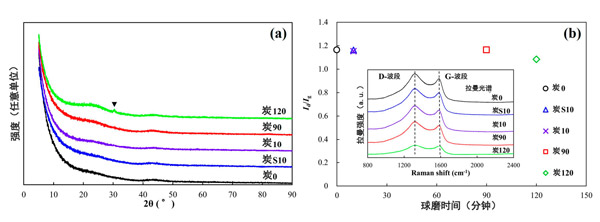 圖1:XRD圖案和研磨時間之間的關系和活性炭的值。(a)X射線衍射圖案,(b)拉曼光譜值。
