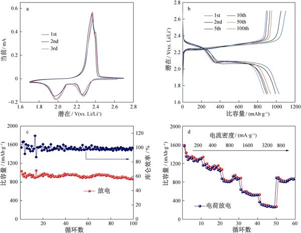 為了評估活性炭作為陰極的電化學性能,將鋰箔作為陽極組裝到鋰硫電池的紐扣電池中。用于第一,第二和第三個循環的循環伏安圖(CV)曲線上在0.05毫伏·秒的掃描速率的電位窗口進行(圖2A)。在第一循環期間,觀察到兩個陰極峰在2.26和1.97 V,CV曲線中最初的幾個循環幾乎重疊,這表明循環穩定性極佳,容量保持率相對較高�;钚蕴康暮汶娏鞒潆�/放電曲線和循環穩定性的測試中,如在圖中所描述2B、C�;钚蕴侩姌O的首次放電容量為1045 mAh·g -1,約為硫理論容量的62.5%。此外,活性炭電極在第100次循環時也顯示出869.8mAh·g -1的放電容量。如圖2d所示測量活性炭的倍率性能,在200–3200 mA·g -1下表現出1260、1050、806、513、290 mAh·g -1的可逆放電容量。此外,當電流密度達到800 mA·g時,活性炭陰極的放電容量為802 mAh·g -1。多孔活性炭材料表現出中等的鋰硫電池電化學性能,顯示出高性能鋰硫電池的潛力。
