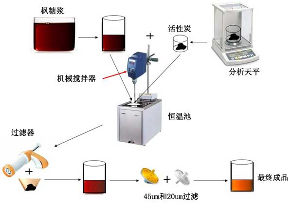 根據(jù)實驗測試活性炭使黑楓糖漿變色的機制,使用食品級活性炭作為吸附材料,以改善深色楓糖漿的顏色和氣味/味道,從而生產(chǎn)與淡糖漿或琥珀色糖漿。圖1說明了該測試中使用的變色過程。為了進行實驗,我們使用了不同量的活性炭(0.01、0.03和0.05 g),并引入10 mL楓糖漿樣品中,以得到0.1、0.3和0.5g/100 mL的最終濃度。然后,將混合物放入恒溫池中,以便通過使用電動攪拌裝置來調(diào)節(jié)工作溫度和攪拌速度。攪拌(混合)時間設置為20、40和60分鐘。在混合時間結(jié)束時,首先通過使用簡單的紙過濾器過濾混合物,以去除使用過的活性炭的大顆粒。通過使用兩個分別具有45和20μm的篩孔尺寸的注射器過濾器進行第二次過濾。