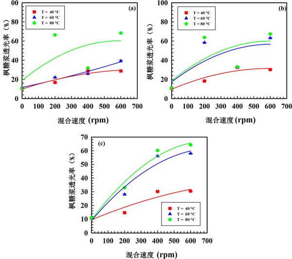 圖4:在固定工作溫度和活性炭粒徑下,透光率與混合速度的關系:(a)25μm,(b)50μm,(c)75μm。